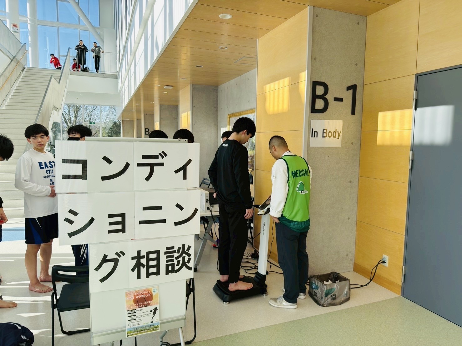 当日は選手のケガ予防とコンディショニング向上を目的に、会場内にサポートブースを設置し、コンディショニング相談を10名、InBodyによる体組成測定を111名、ヨガを用いたケガ予防トレーニングを83名の選手に実施しました。コンディショニング相談では、当院スタッフが選手一人ひとりの身体状況を確認し、日頃のコンディション管理やケガ予防に関するアドバイスを行いました。選手や指導者の皆さまが熱心に耳を傾けてくださる姿が印象的でした。