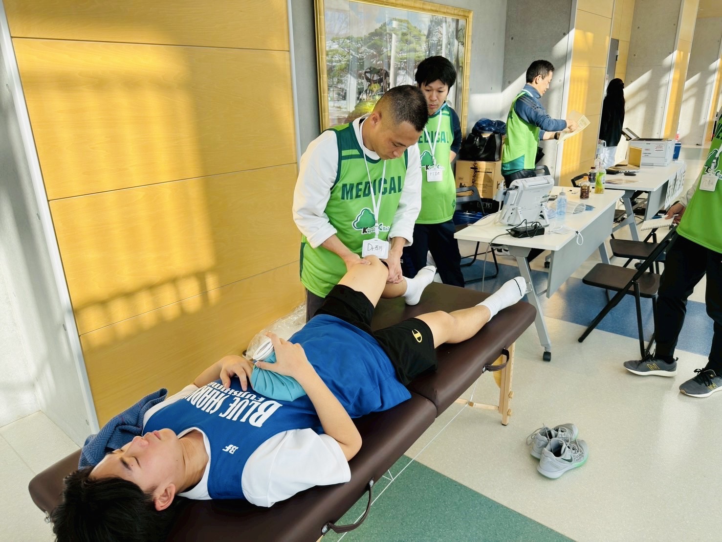 当日は選手のケガ予防とコンディショニング向上を目的に、会場内にサポートブースを設置し、コンディショニング相談を10名、InBodyによる体組成測定を111名、ヨガを用いたケガ予防トレーニングを83名の選手に実施しました。コンディショニング相談では、当院スタッフが選手一人ひとりの身体状況を確認し、日頃のコンディション管理やケガ予防に関するアドバイスを行いました。選手や指導者の皆さまが熱心に耳を傾けてくださる姿が印象的でした。