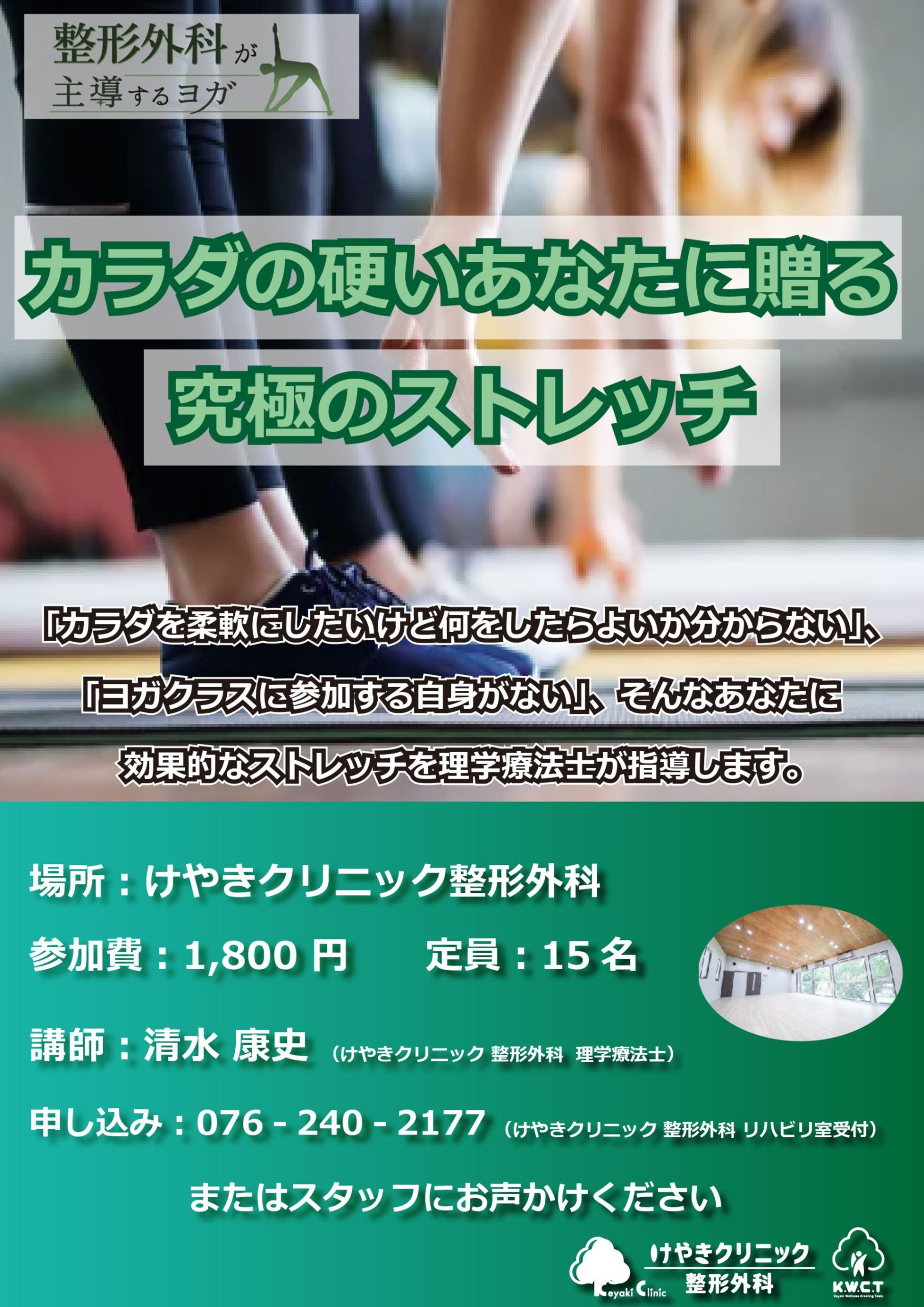 雪の舞う天候でしたが、11名の方にご参加いただき、当院理学療法士・清水が講師をつとめました。新年最初のストレッチクラスでしたので、新たな目標を持って継続して取り組んでいただけることを期待しています。