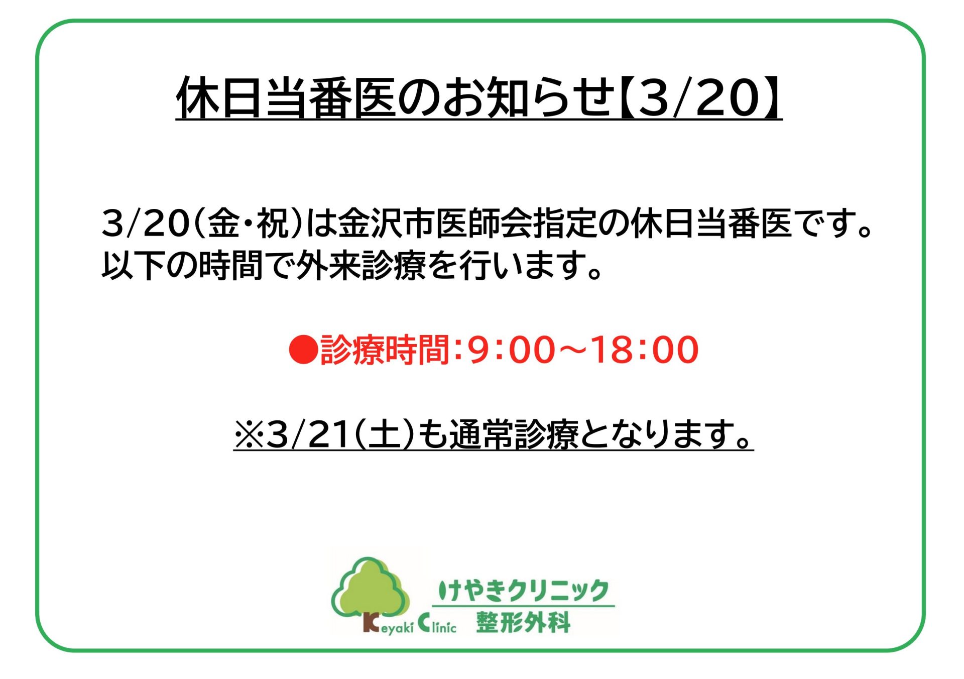 3/20(金・祝)は金沢市医師会指定の休日当番医です。